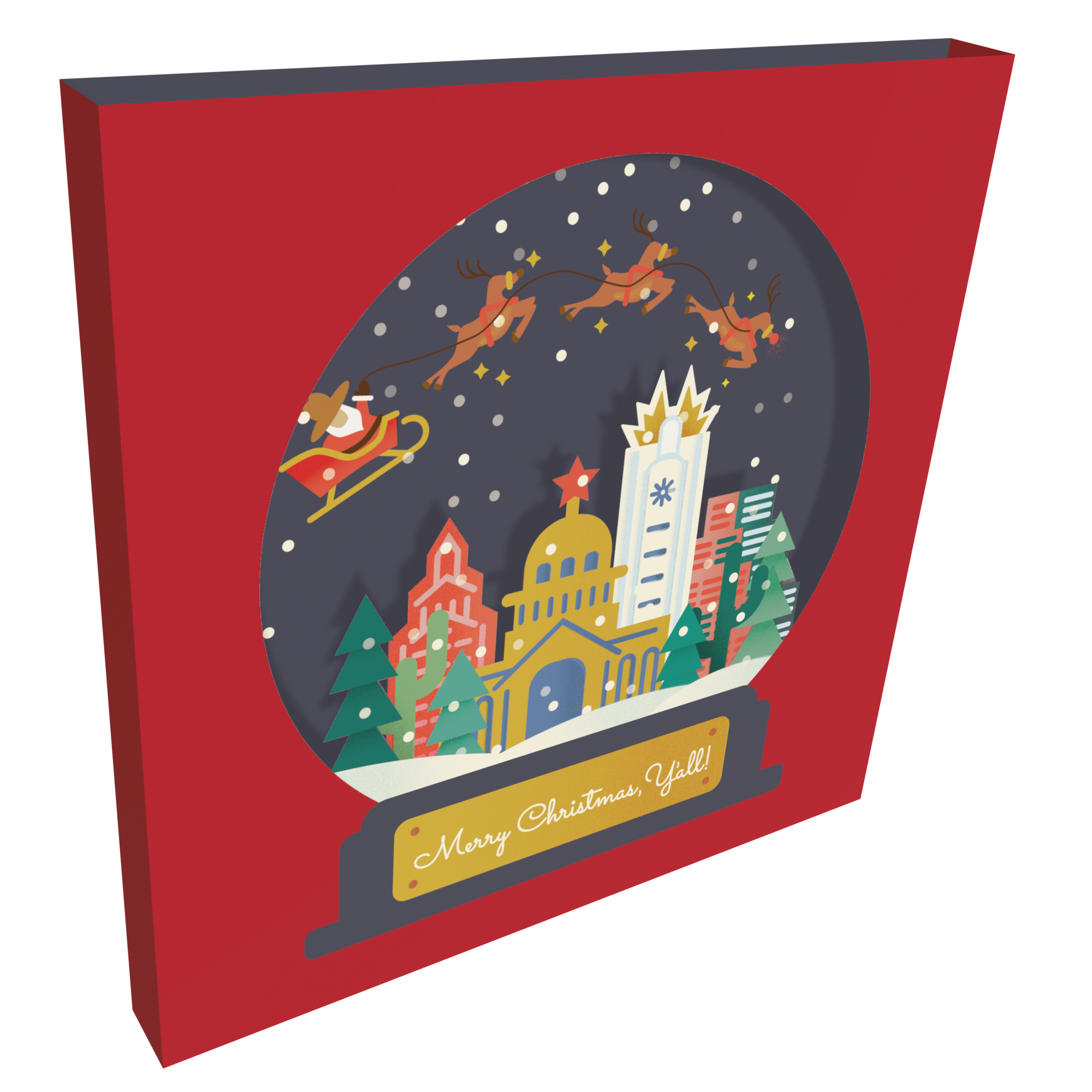 A Texas-themed Christmas Easy Pop card featuring Santa and his twelve reindeer. Folds flat and opens instantly into a clean, festive snow globe scene. Stand or hang, it's up to you!