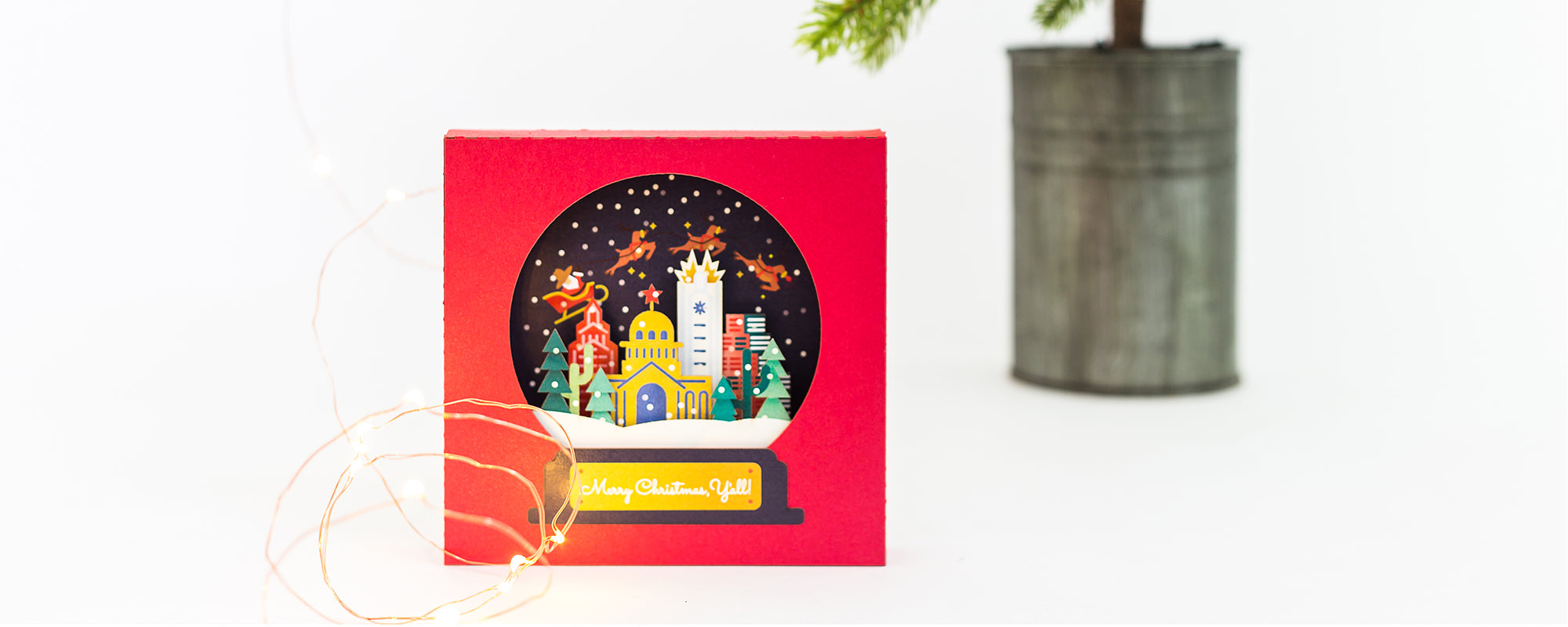 What could be better than catching a glimpse of Santa's sleigh, you ask? How about catching a glimpse of Santa's sleigh as he, Rudolf, and the other eight (less cool) reindeer glide effortlessly through the night sky above iconic downtown Austin? And how about capturing that magical moment inside an equally magical snow globe—one that doesn't break? Merry Christmas, y'all! Features five (5) layers.