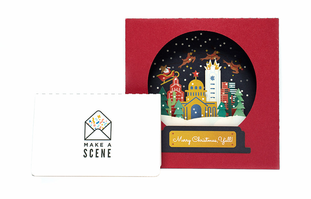 Size: Our Texas Snow Globe pop-up card is 5 ¼ in. x 5 ¼ in. x 1 in. (open) / 5 ¼ in. x 6 in. (closed).