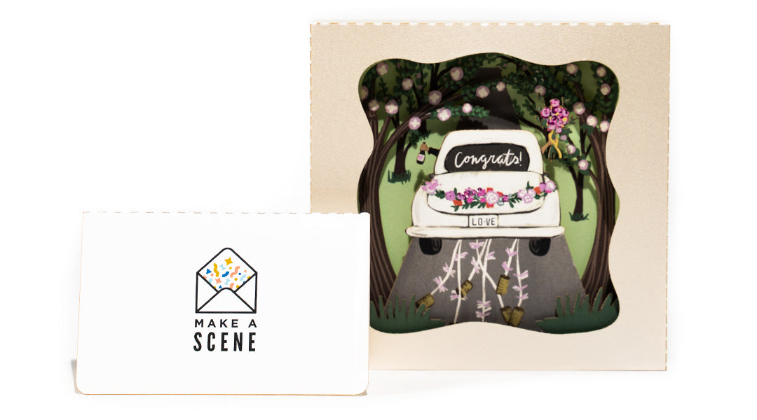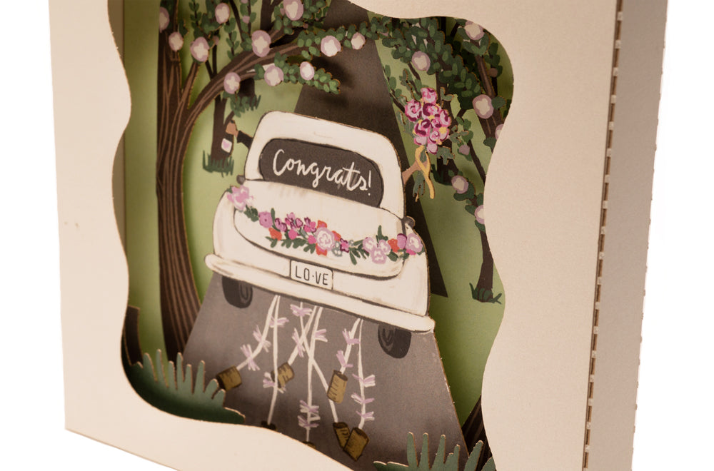 Congratulate and celebrate the happy couple with a card designed to do just that! Bride and groom are whisked away to their wedding escape as they cruise beneath fairy tale trees and overhanging florals in a vintage getaway car. From first to last, every detail of our Wedding Congrats card speaks to the love that is in the air, both now and for years to come. Features four (4) layers.